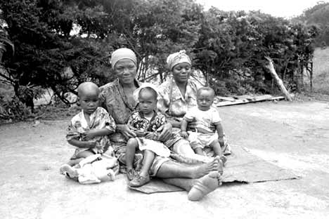 Assises dans la cour de la maison, sur une natte, les jambes étendues, les chevilles croisées, une attitude habituelle de femmes mûres dans un moment de loisir, c'est aussi une position littéralement inférieure et symboliquement significative. Voir la femme en pleurs du peintre Zaza. Les enfants s'agglomèrent autour des mères, tantes, grand-mères, écoutent les conversations des femmes entre elles.